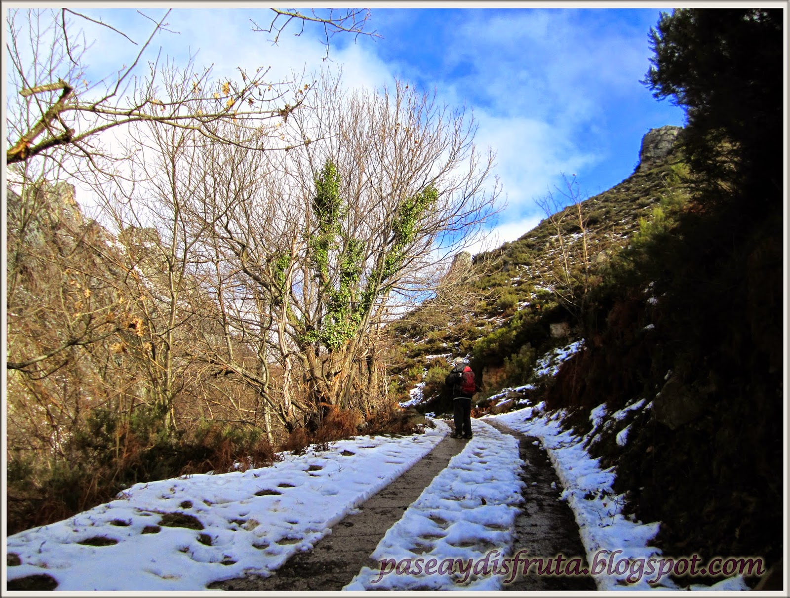 Parada necesaria para contemplar este paisaje de postal, donde predomina el blanco contrastando con el oscuro de cierres y troncos, y en el cielo unas bonitas pinceladas realizadas por las deshilachadas ramas.